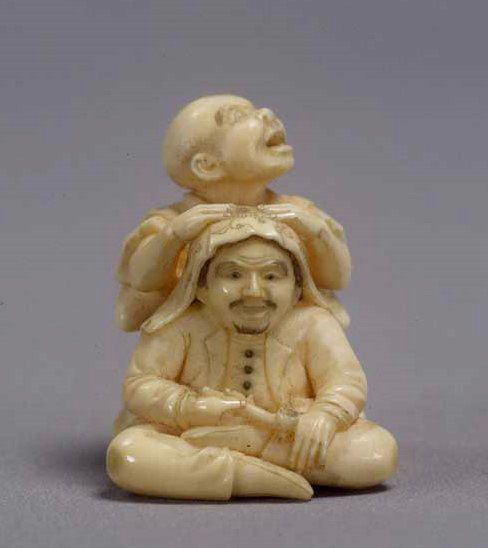 江戸時代・19世紀高3.3線刻銘「陵民(花押)」東京国立博物館郷誠之助氏寄贈西洋人の頭に手拭のような布をかぶせてマッサージをする按摩。盲人の滑稽な仕草をユーモラスに描くのは江戸~明治の彫刻の一つの特徴である。手拭には細かな模様が彫りこまれて...