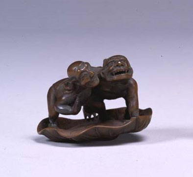 江戸時代・19世紀高3.0線刻銘「鴇楽民」東京国立博物館郷誠之助氏寄贈蓮の葉の上で鬼と羅漢が相撲をする意匠。同じく郷コレクションの「鴇楽民」銘「鬼羅漢角力牙彫根付」と同じ構図である。ColBaseには他のコレクションとまとめて撮りされた画像...