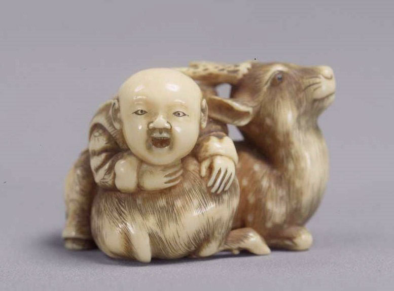 江戸時代・18世紀高3.3線刻銘「蘭亭」東京国立博物館郷誠之助氏寄贈四肢を畳んで根付らしいポーズをとる鹿の造形は古根付のような趣があるが、唐子の表情はグロテスク。「目が死んでいる」というのだろうか。銘は「蘭亭」。出典:国立博物館所蔵品統合検...