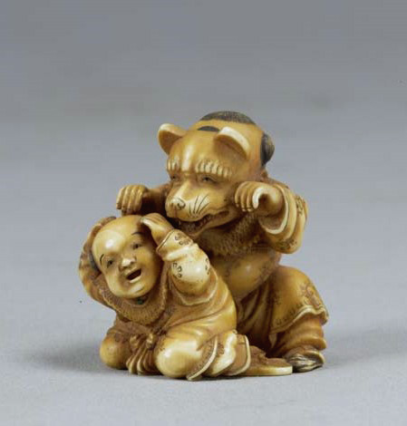 江戸時代・19世紀高2.4銘「秀親」東京国立博物館郷誠之助氏寄贈狐の面をつけておどかす唐子と、頭を抱えるようにして怖がる仕草をする唐子。郷コレクションの中でも非常に印象的な置物根付である。昭和58年に日本象牙彫刻会と株式会社東和から限定70...