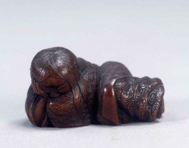 着物の模様と流れるような長髪の彫に根付師の腕の確かさが見て取れる。