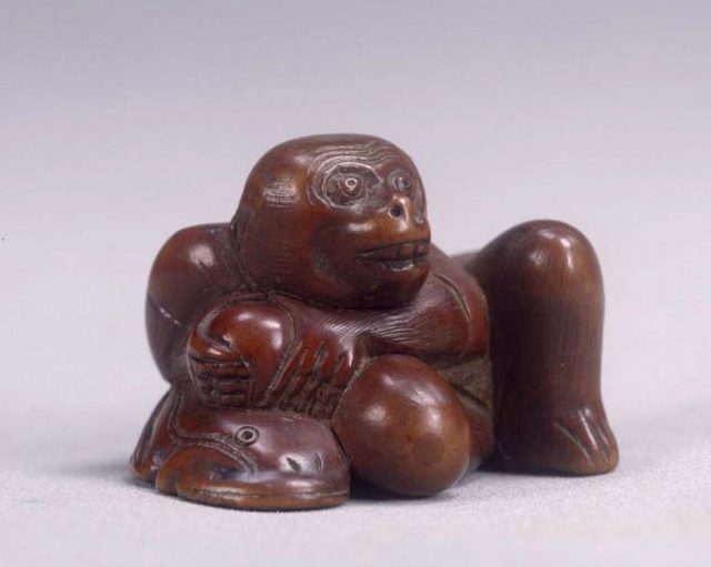 「霞月」は上田令吉「根附の研究」によると「木刻を主とす、天保頃の人なり」とのこと。