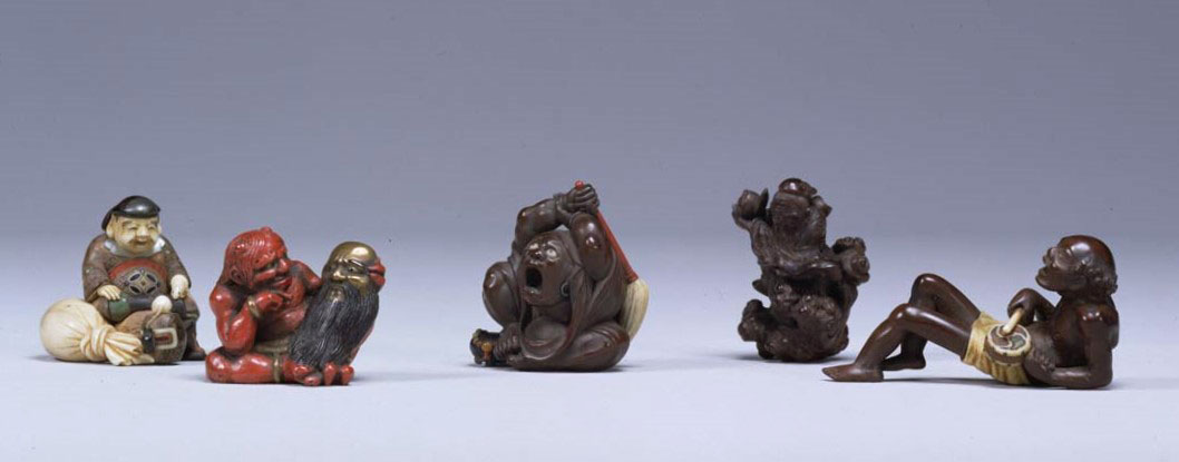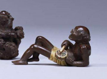 黒奴木彫根付 ColBase 2018.12.242018.12.29 江戸時代・19世紀 高2.8 無銘 東京国立博物館 郷誠之助氏寄贈 今となっては言及するのすら憚られるような図案だが、当時の人々にとっては珍奇なデザインであったのであろうと推測される。 郷コレクションの一つ。 同じく黒人がサンゴの入った壺を抱えている意匠のものもよく見かける。 東京国立博物館の写真が他の根付と並べて撮られているため、画像が見づらいのが難である。 元の集合写真がこちら。 出典:国立博物館所蔵品統合検索システム