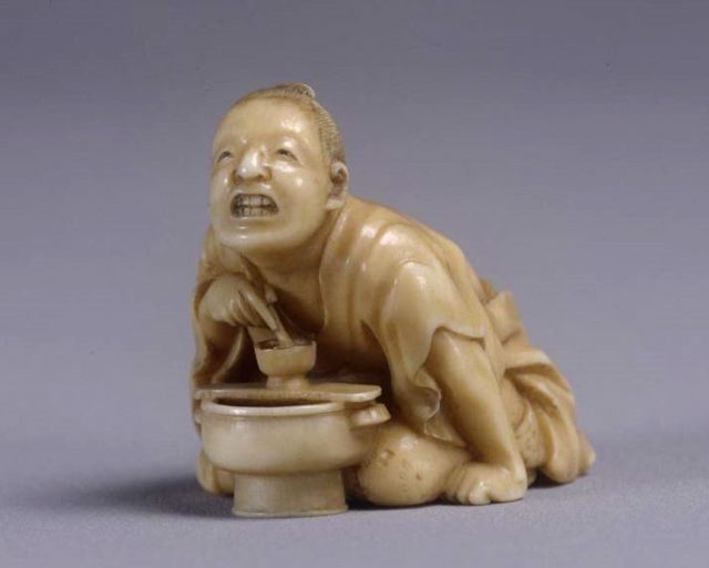 鉄漿(おはぐろ)を付ける人の姿を象った写実的な置物。