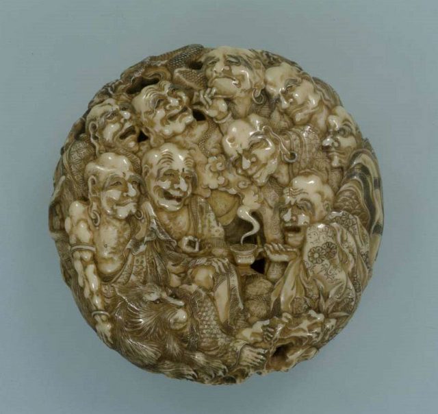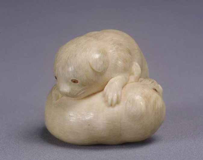 表裏両面に巧みな彫が施された大ぶりな饅頭根付。