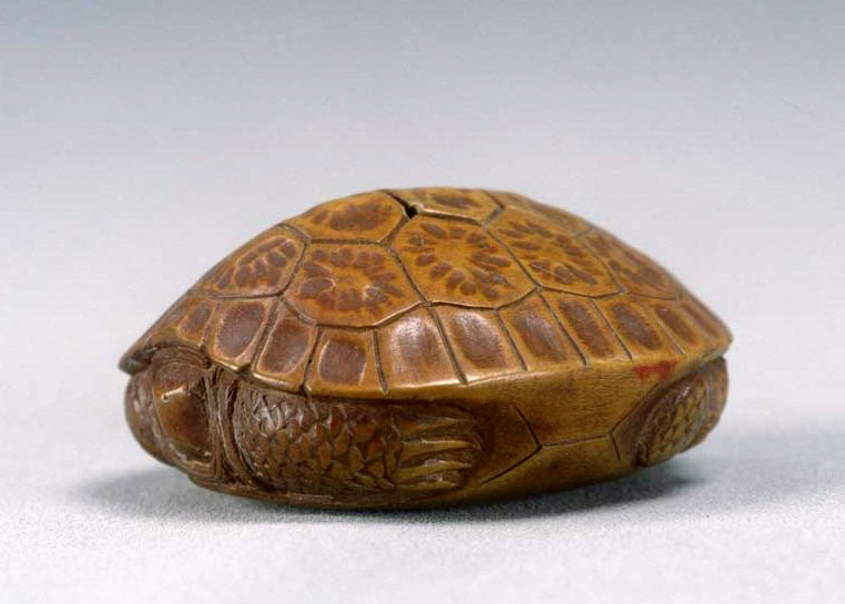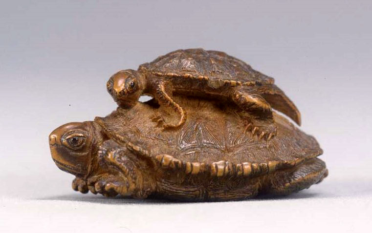 ColBase 親子亀木彫根付 江戸時代・18世紀高2.1線刻銘「左一山」東京国立博物館親亀の上に子亀がのる構図。根付としての塊感があり、亀の表情に当時の人々のセンスが感じられる。甲羅や爪の彫も細かで丁寧。「左一山」は天明寛政頃の會津の人。蝸牛木彫根付もある。出典:国立博... 2018.12.22 ColBase