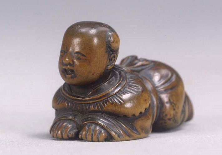 江戸時代・19世紀高2.6線刻銘「法延」東京国立博物館唐子は頭がやたら大きく、表情もややグロテスクな意匠のものが多いが、これはバランスがよく愛らしい表情である。使いこまれた感のあるなれ具合に民具としての趣がある。「法延」は、上田令吉「根附の...