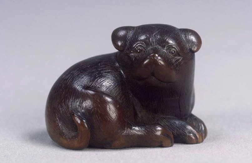 江戸時代・18世紀高2.3線刻銘「蘭亭」東京国立博物館郷誠之助氏寄贈鮑の貝殻と子犬の組み合わせは根付で多く見られる。安産祈願や多産、子孫繁栄の願いが込められているのであろう。貝殻に引っかかった紐を噛んで遊ぶ子犬の姿がほほえましい。「蘭亭」の...