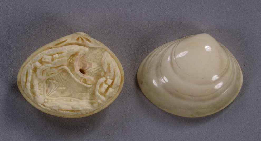 ColBase 蛤牙彫根付 江戸時代・19世紀長径4.4線刻銘「懐玉斎正次」東京国立博物館郷誠之助氏寄贈蛤の内側に天橋立の風景を彫り込んだ作。東京国立博物館のこの画像は角度が悪くて天橋立がよくわからないのが残念である。「懐玉齋正次」は正次が五十歳頃以降に用いた銘。文化... 2018.12.25 ColBase