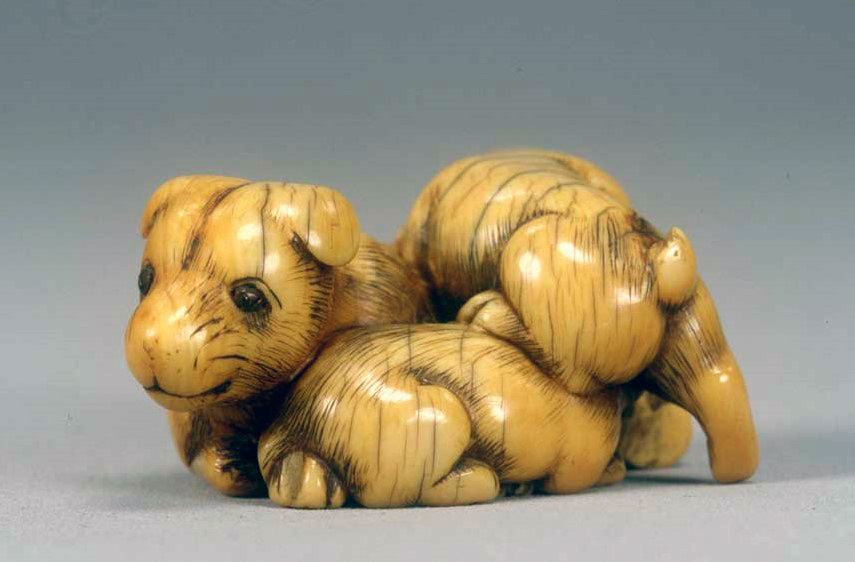 江戸時代・18世紀高2.3線刻銘「蘭亭」東京国立博物館江戸時代の根付師の中でも人気の高い「蘭亭」の銘が刻まれた作品。時代を感じさせる色合いとなれ具合。象牙特有の小さなひびにも趣がある。根付として使うには小犬の左後ろ足が折れそうで不安だが、見...